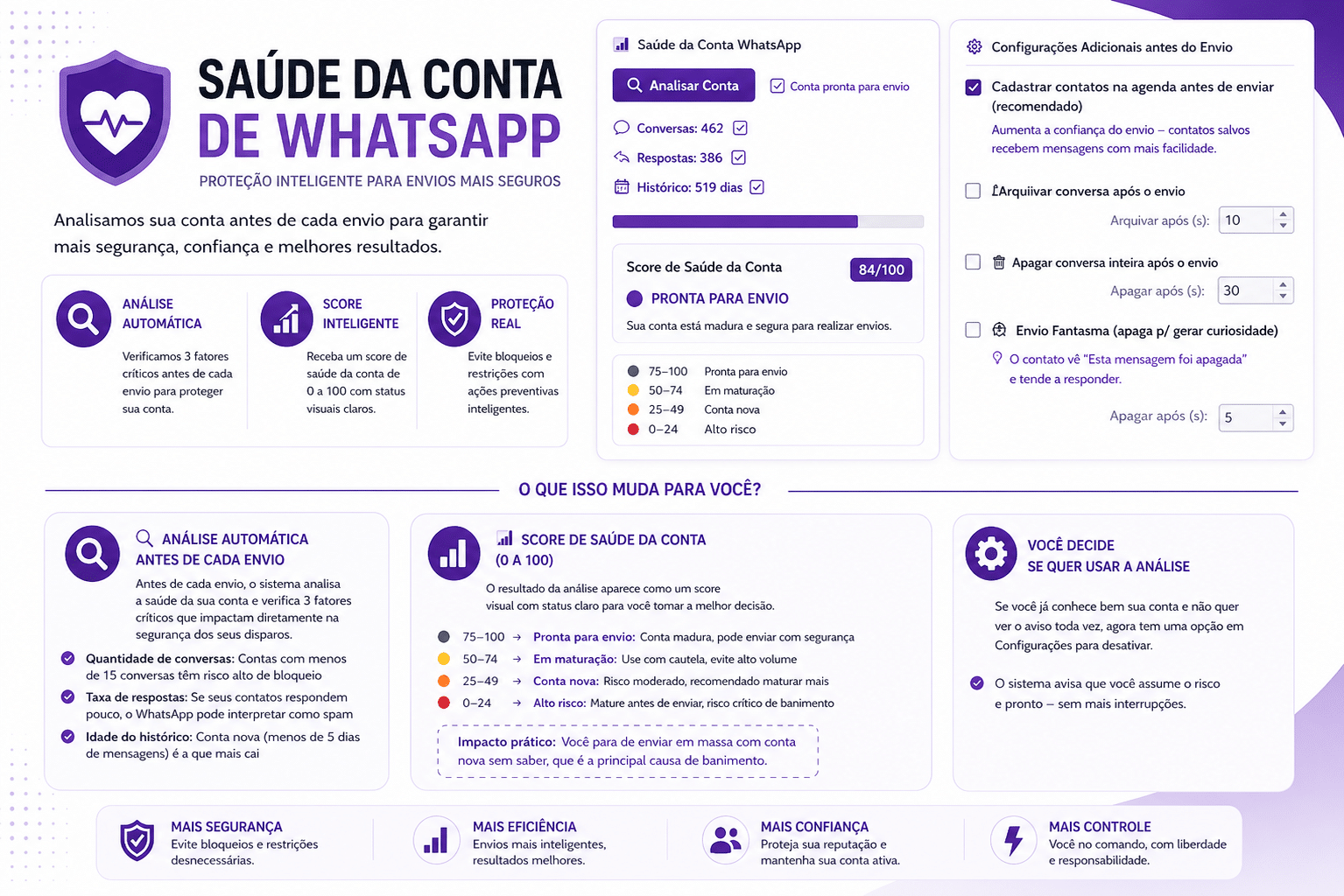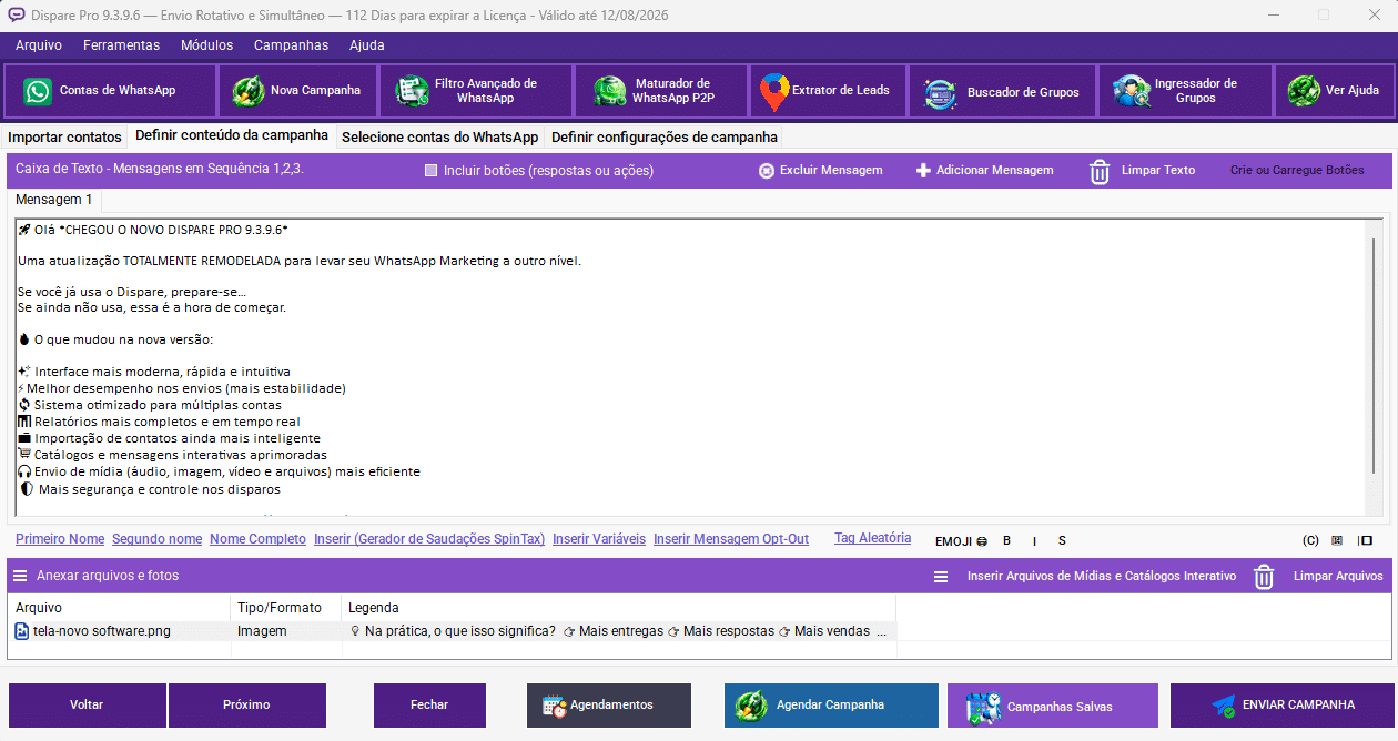 Configuração simples e intuitiva, você já pode personalizar suas mensagens e listas de contatos.